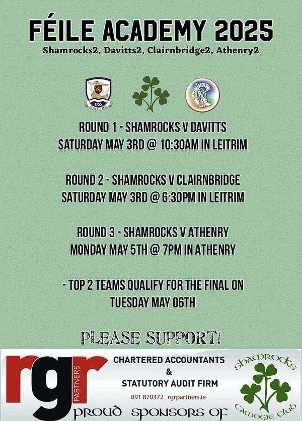 We are lucky enough to be able to have two U15 teams in our club, along with other clubs in the county. Féile Academy is a new tournament by the Camogie board this year which sees second teams in clubs competing, which begins tomorrow Saturday May 03rd.